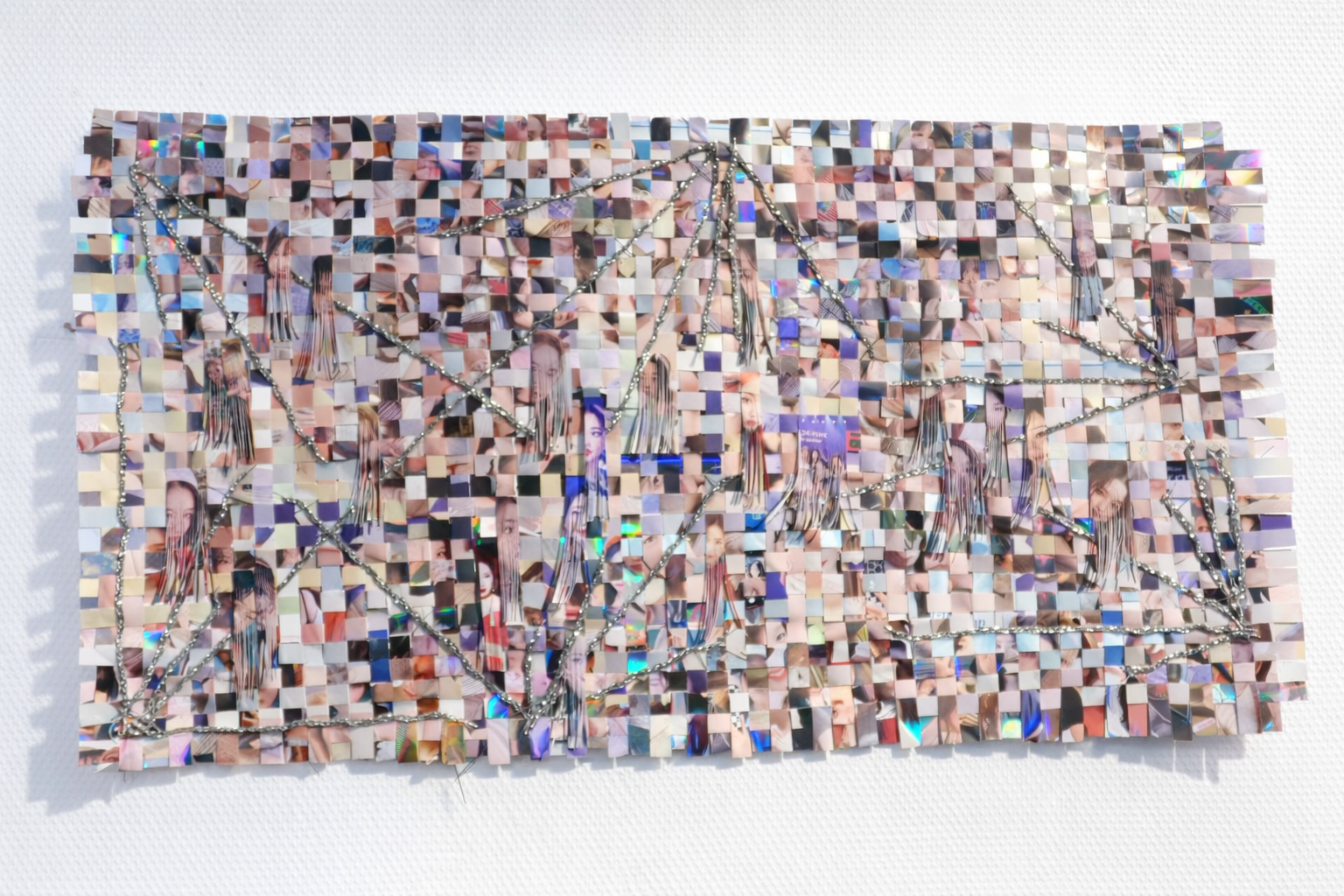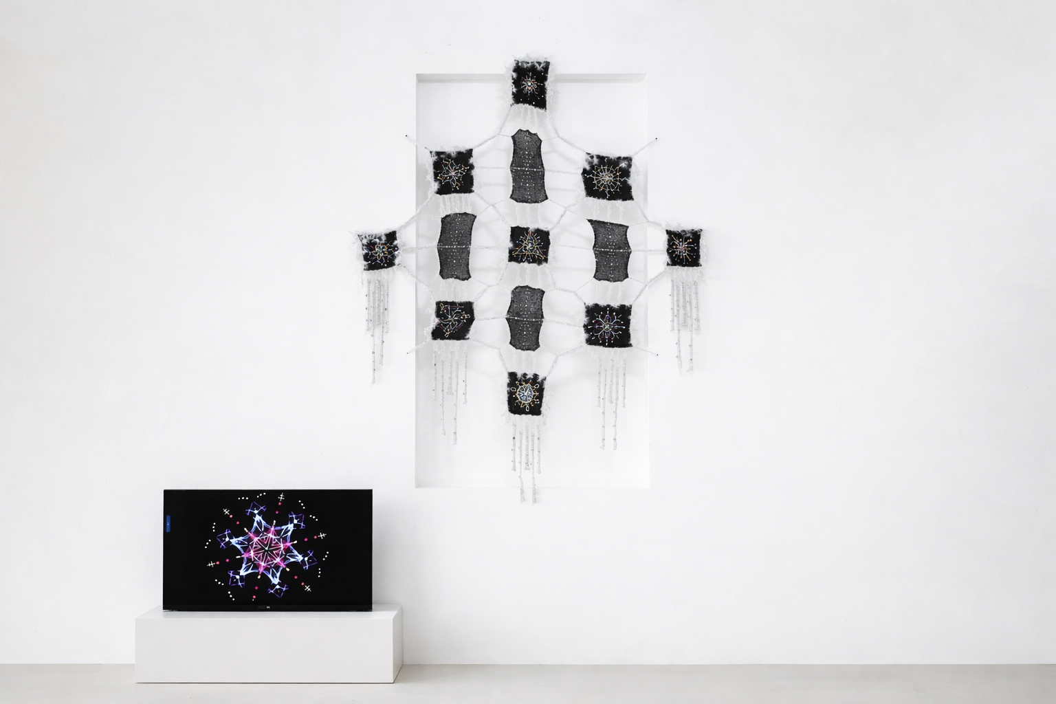 In Shenlu’s work, weaving techniques extend to optical fibers and non-biological materials. Through the interlacing of algorithmic patterns and human intervention, inert matter appears “activated.” Threads of silk, metal wires, and glass beads form structures that function as an “energy language”—not merely geometric compositions but responsive configurations shaped by material properties themselves. At the same time, this process raises questions of authorship, control, and technological limits: is the vitality observed in these structures emergent, or is it pre-defined and constrained by human and algorithmic design?
